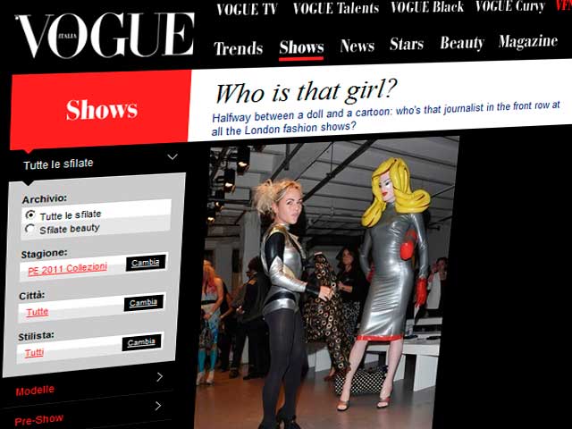 Seated in the front row of all the main shows at London Fashion week, dressed in latex and wearing a doll mask over her face, a showy mane of blond hair and sometimes in the company of a white stuffed dog: everyone’s wondering who this journalist really is.
