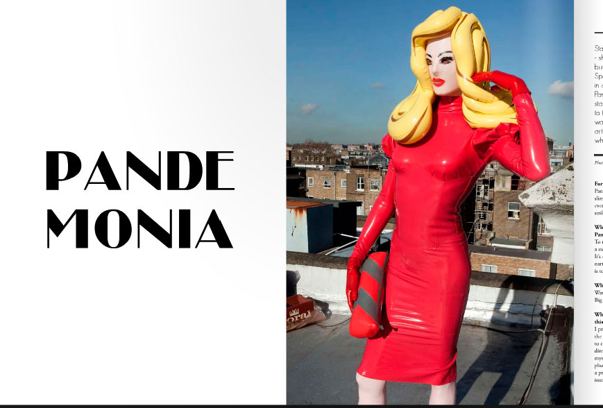 Standing tall, slender, blonde and shiny – she grabs wolf whistles from admiring builders as she struts down the street. Spotted on the front row and featured in everything from iD to Vogue Italia. Pandemonia is not a new IT girl or rock star offspring – turn – model. Covered head to toe in latex she is a living, breathing walking, talking piece of post – modern art. Perplexed and fascinated, IDOL asks who is Pandemonia.