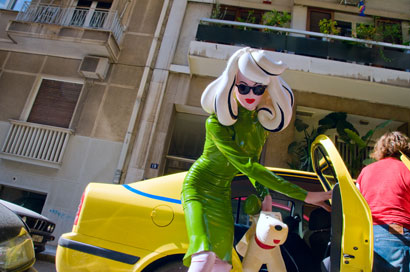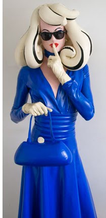 What is perhaps most telling about the concept of Pandemonia is the fact she is female, clearly a considered point when she was created, “I wanted to make her female because in the public arena 90% of visual appeal is female. Females command more public interest and the female form is more appeasing to the naked eye. If you’re a visual artist it’s better to have something people like to look at. Both male and females like to look at the female form”. Boasting model proportions, Pandemonia is certainly something to look at. Clad in tighter-than-tight rubber and body con dresses, dark glasses and towering heels, it’s fair to assume she reflects what she sees in the modern world of the celebrity “Yes, Pandemonia mirrors the world” she agrees. “Images from adverts, newspapers and fashion designers around the world are interpreted into the Pandemonia style. As a figurative artist I use traditional methods of drawing and modeling in clay to develop each piece. Like a logo I always go for clean lines and strong colors. Pandemonia is designed to be seen and reproduced; the mediated Pandemonia experience is as relevant to seeing her first hand”.
